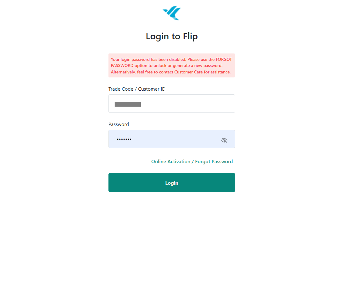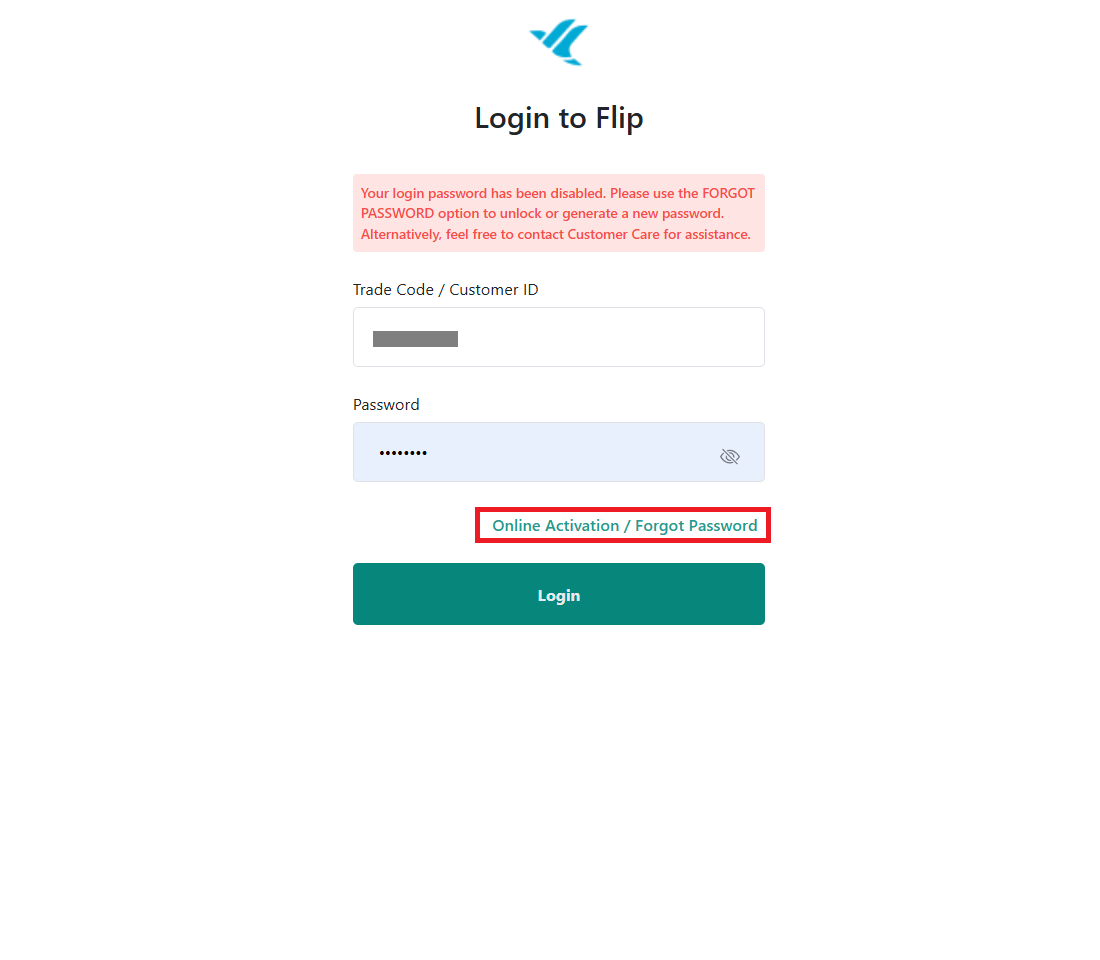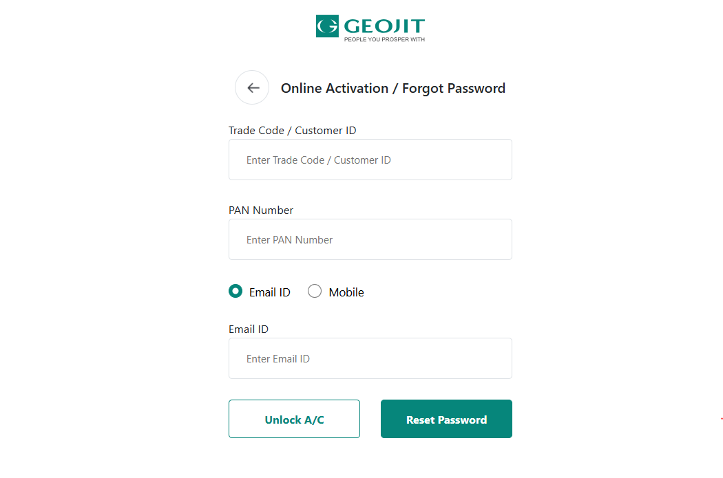 Step 1. Go to the MyGeojit / Flip login page and select Online Activation/ Forgot Password.